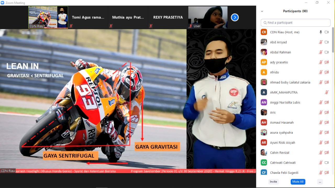 Pekanbaru – PT Astra Honda Motor (AHM) dan PT Capella Dinamik Nusantara (CDN) Main Dealer Honda wilayah Riau tetap konsisten memberikan edukasi keselamatan berkendara kepada masyarakat meskipun dalam masa pandemi. Sebagai bentuk tanggung jawab sosial dan meningkatkan kepedulian masyarakat terhadap berkendara yang aman dan mengurangi resiko kecelakaan. Edukasi secara virtual dilakukan tim Safety Riding PT CDN melalui web seminar.