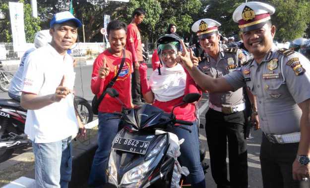 Karyawan Capella bersama Polantas Banda Aceh sengaja menyambangi dua persimpangan tersebut untuk membagi-bagikan Helm gratis bagi pengendara wanita maupun tumpangannnya yang tidak memakai helm.
